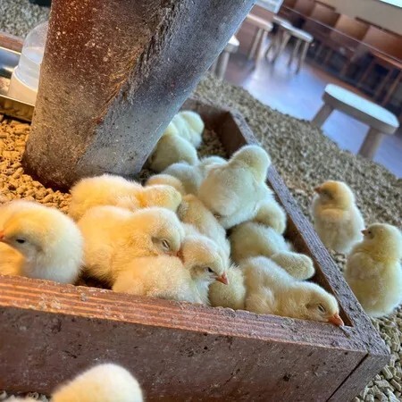 園内の「ひよこふれあいスペース」では、自由に歩き回る150〜200羽ものヒヨコと思う存分ふれあうことができますよ。