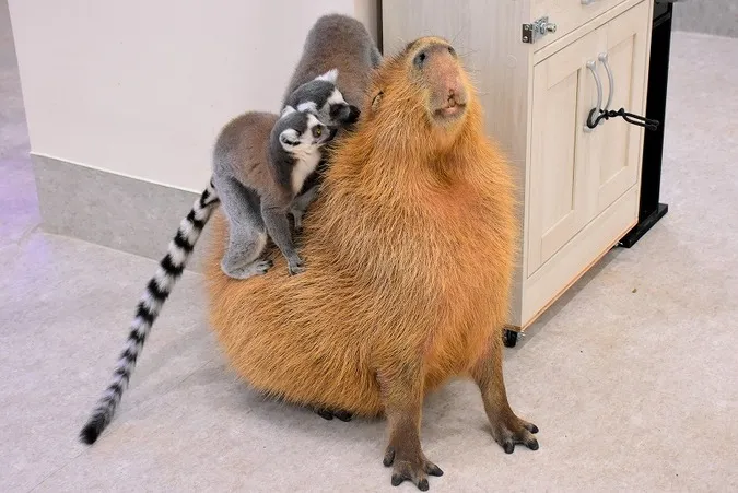 足元を見るとカピバラやサルが自由に歩いている、ゼロ距離の動物体験が最大の魅力です。
