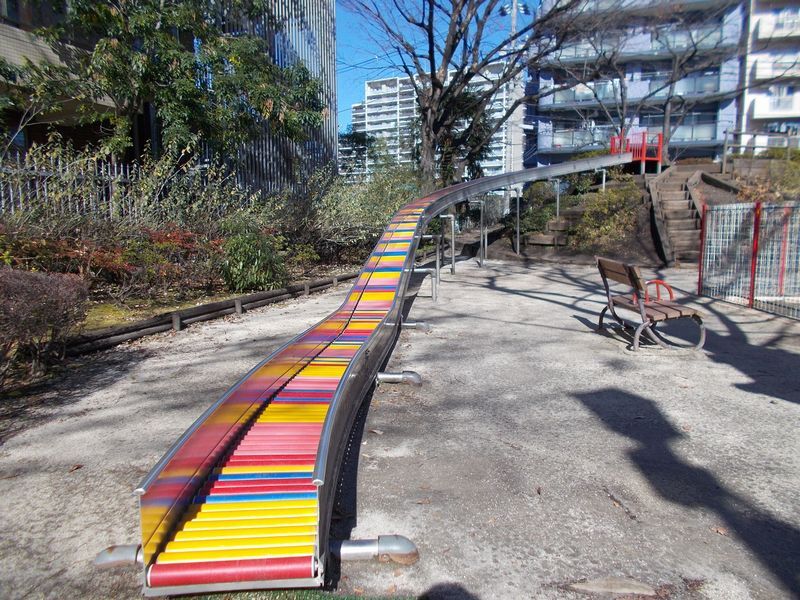 桜やけやきなどの樹木に囲まれ、迫力満点の滝や水遊びができるせせらぎがあります。複合遊具やローラーすべり台、ブランコなど多彩な遊具も充実しているので、親子連れに人気のスポットです。
