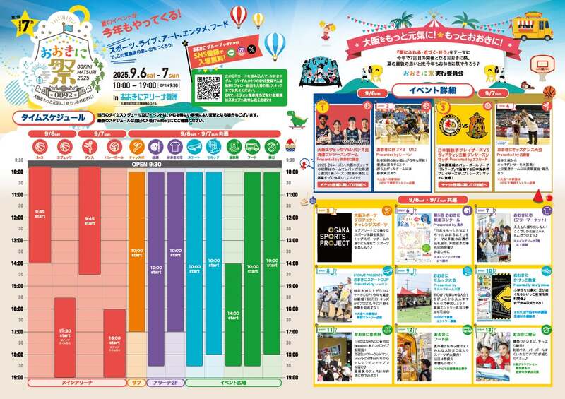 大阪市此花区の「おおきにアリーナ舞洲」で、2025年9月6日(土)・7日(日)に「おおきに祭2025」が開催されます。食べて、遊んで、観て、体験できる総合型イベントで、大人も子供も一日中楽しめる内容が盛りだくさんです。