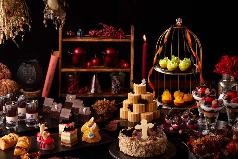 ブッフェテーブルには、大きな十字架やコウモリのモチーフが妖しげな「ハロウィーンカフェ」や、鮮やかな赤とピンクが映えるケーキからおばケガひょっこりと現れる「ピスタチオフランボワーズムース」、つぶらな瞳がまるでこちらを見つめているかのような「ミイラアップルパイ」など、約25種類の個性的なスイーツがずらりと並びます。