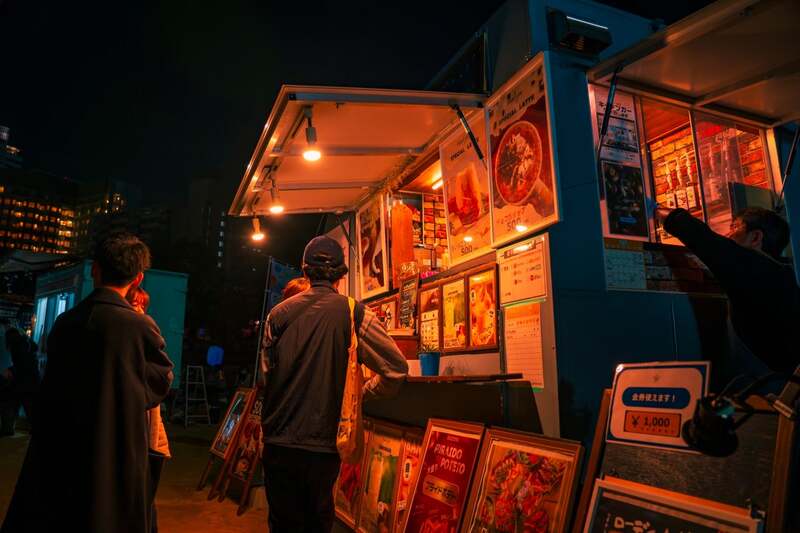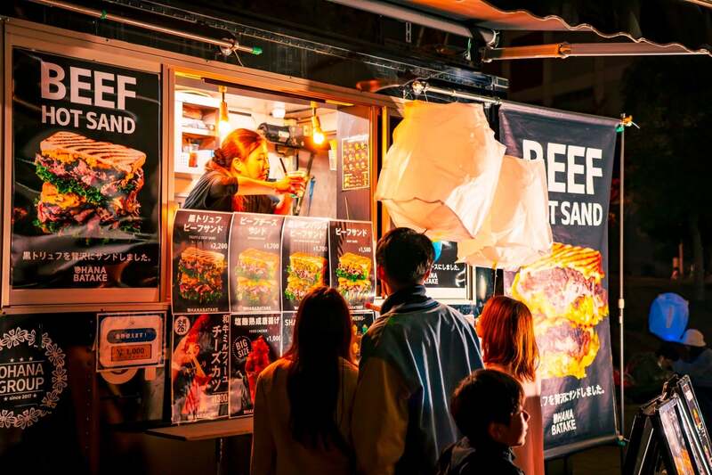 フードトラックエリアでは、秋のあったかグルメを味わいながら、夜空に舞い上がるランタンの幻想的な光景を楽しむことができます。食欲の秋とランタンの美しさを同時に満喫できる特別なひとときです。