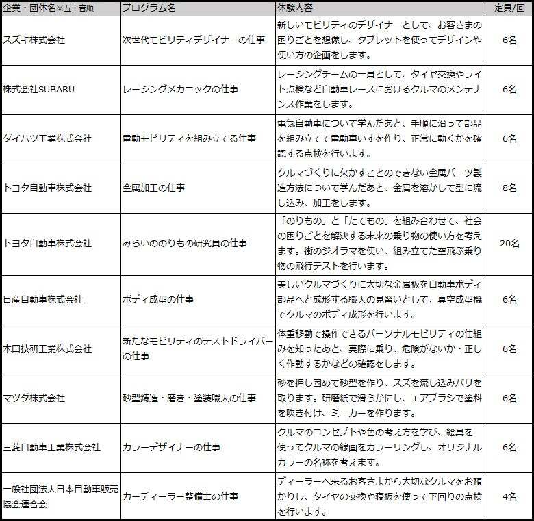 会場では、自動車メーカーや自動車関連企業など9社が、小学生を対象とした10種類の仕事体験プログラムを提供します。