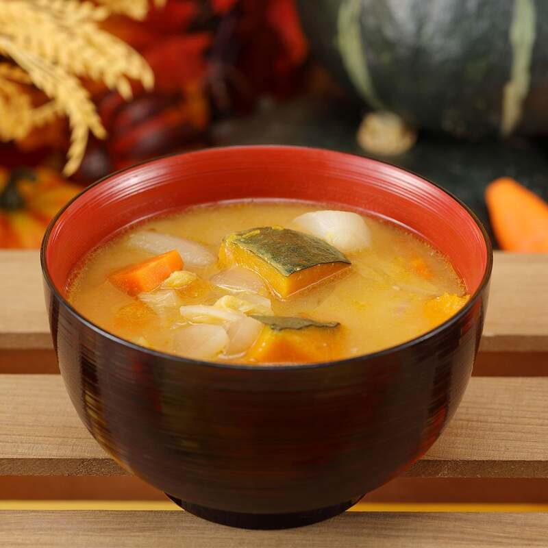 豚汁はスイパラ農園の野菜をたっぷりと使用した白みそ仕立てです。季節ごとに旬の食材を取り入れており、秋はかぼちゃを加えて優しい味わいに仕上げています。