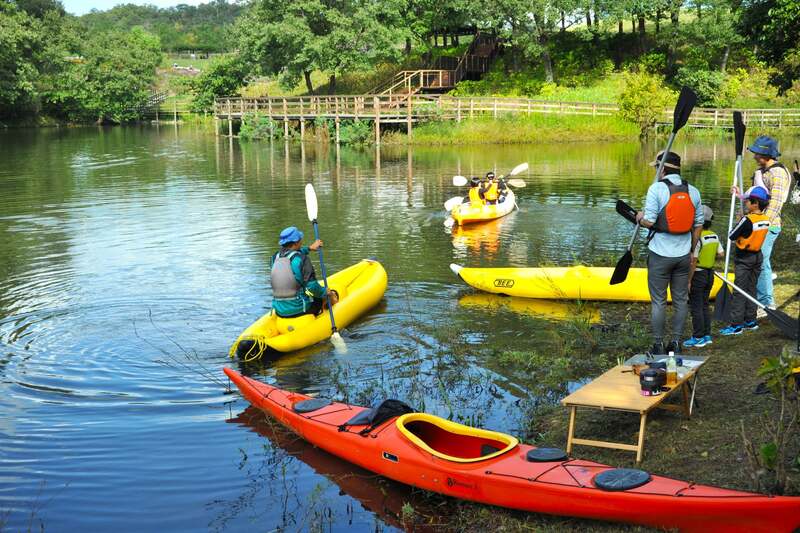 空に向かって高く飛ぶバンジートランポリンは特に子供に大人気。芝生広場に隣接した飛竜池ではカヤック体験もでき、大型スライダーやラジコンカートなど多彩なアクティビティが用意されています。