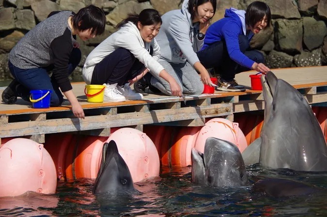 珍しいバンドウイルカの展示や、自然の入江を利用した体験プログラムもあり、イルカやクジラにエサをあげたり、クリアーカヤックで観察したりできます。