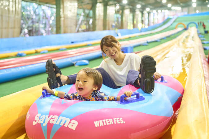 「狭山スキー場」の夏営業「ウォーターフェス」では、全天候型のゲレンデを利用した水遊びが楽しめます。