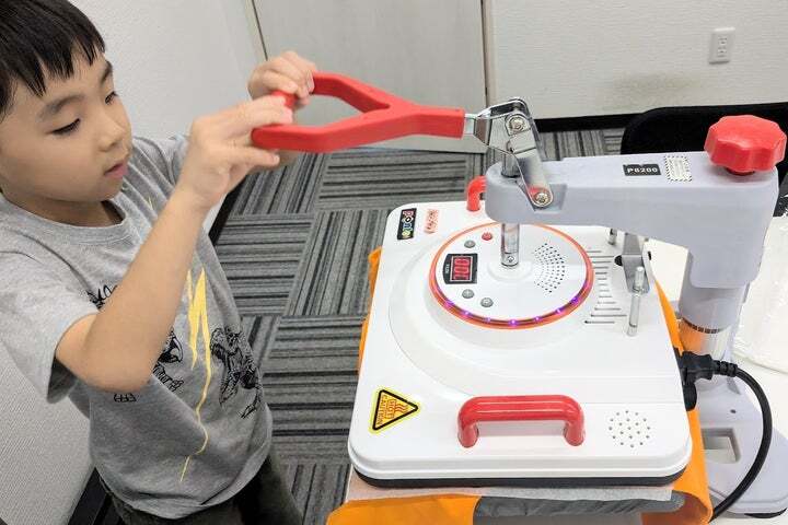 さらに、プロが使う業務用のデザインシートをアイテムにのせたあと、業務用プレス機で熱を加えてプリントする本格的な工程も体験できます。実際のノベルティグッズ作りと同じ流れで、自分のアイテムが完成していく様子を楽しめます。