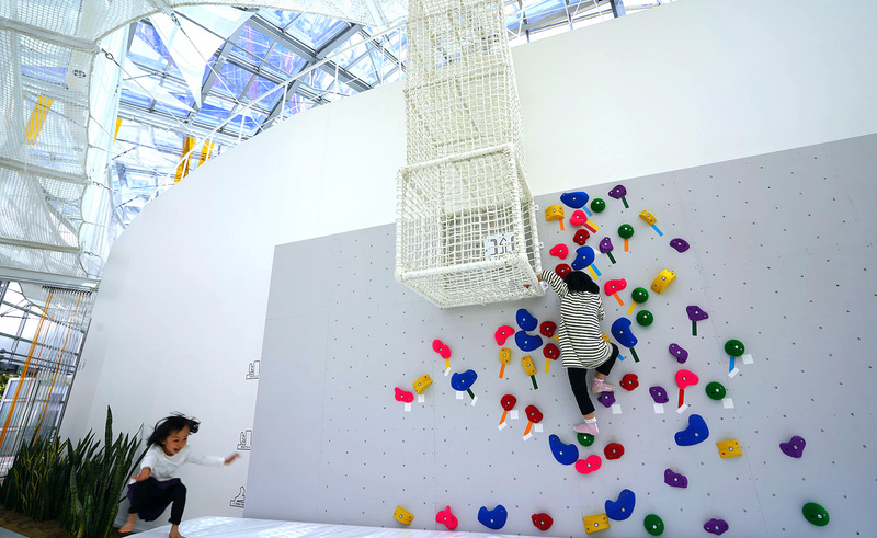 園内には長いネット遊具やふわふわドーム、木育遊具など、子どもが楽しめる設備が充実。温室では熱帯・亜熱帯の植物が見られ、ネット遊具から上から眺められます。