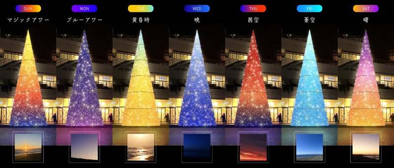 湘南の海と空からインスピレーションを得た15mの巨大ツリーが登場し、月曜日〜日曜日までの7日間、毎日色が変化する幻想的な光景が楽しめます。