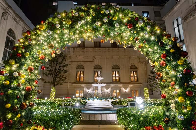 本館中庭では、合計1.5万球の煌めくイルミネーションが点灯します。中央に噴水を配した緑あふれるヨーロッパ調の美しい庭園で、ロマンティックな空間を楽しめます。