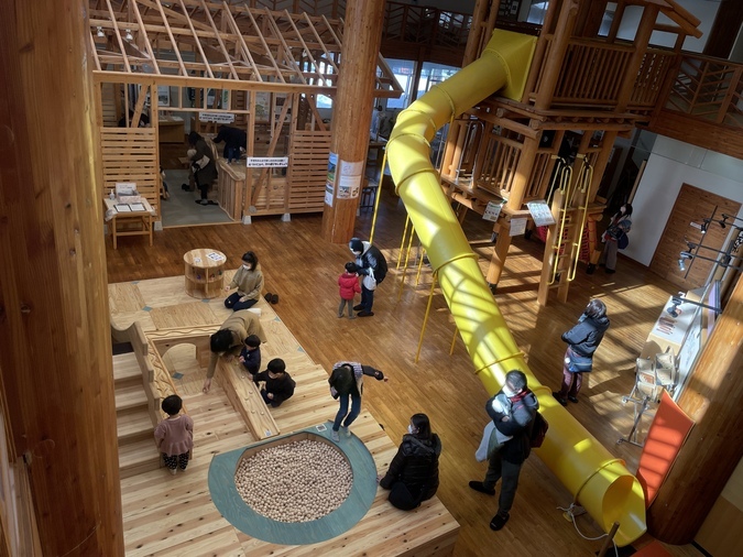 八幡平の職人が手掛けた木育コーナーには、木製おもちゃや漆塗りの滑り台などがあり、子供から大人まで楽しめます。