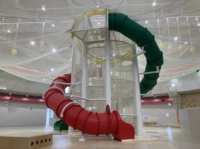 屋内は年齢に合わせた5つのゾーンに分かれており、ベビーから小学生まで楽しめます。屋外遊び場も併設され、洞窟のような地下通路で行き来できるのも魅力。