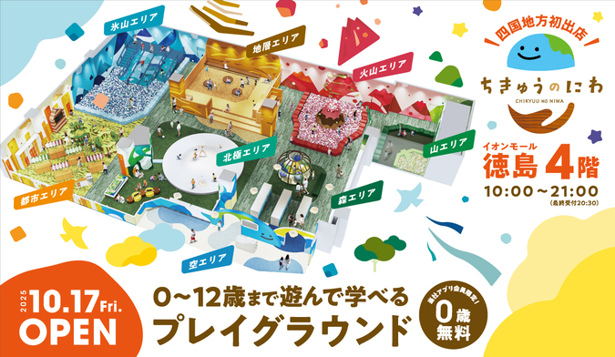 2025年10月17日(金)、イオンモール徳島に屋内型こどもの遊び場「ちきゅうのにわ 徳島店」がオープンします!