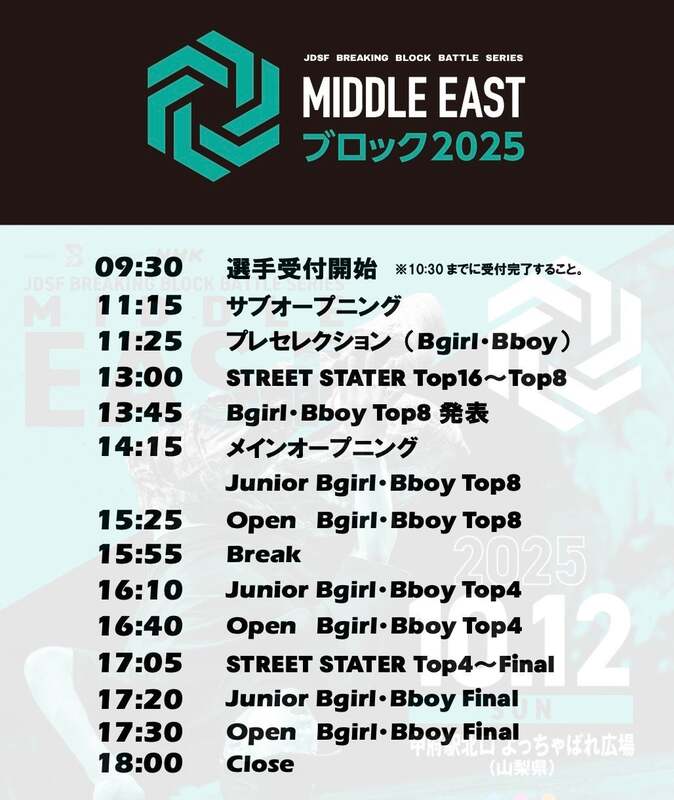 前日の10月12日(日)には、山梨県では初めてとなるMIDDLE EASTブロック選手権2025が同会場で開催されます。こちらも入場観戦は無料で、ジュニアとオープンの4カテゴリーで熱戦が繰り広げられます。