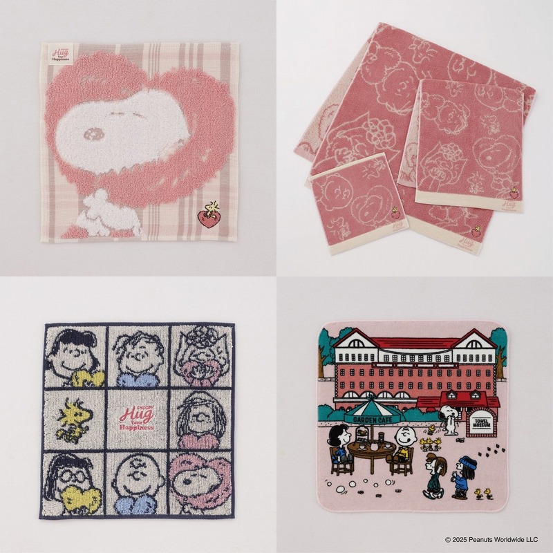 タオル美術館25周年も祝うダブルアニバーサリー企画として、約80点におよぶ展示がタオル織のさまざまな手法で繊細かつダイナミックに表現されています。メインアートには、あたたかなタオルに包まれたスヌーピーと、ひとつのタオルでつながるPEANUTSの仲間たちが描かれています。