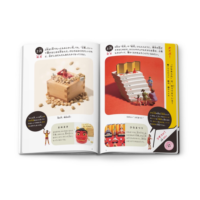 トランプやボタンなど身近なものを全く別の物に見立てるアートとともに、日本の四季をめぐる旅を楽しめます。アートにまつわるクイズとシールも付いています。