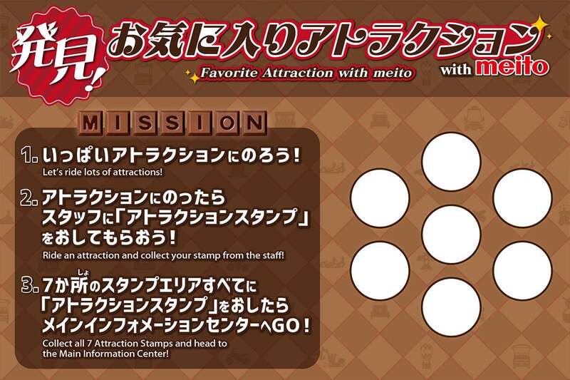 パーク内のさまざまなアトラクションを巡りながら、お気に入りのアトラクションを見つけるスタンプラリー「いっぱい"のって"見つけよう!発見!お気に入りアトラクション with meito」が開催されます。