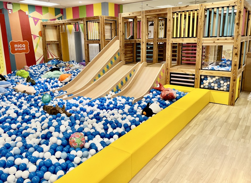 マルイ錦糸町店4Fにある、0歳から遊べる屋内施設「NICOPA&nico ground 丸井錦糸町店」。木製ジャングルジムやボールプール、トリプルスライダーなど、身体全体を使って遊べる遊具が充実しています。