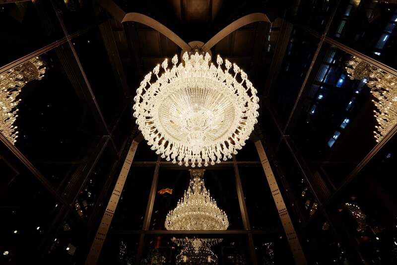 メインとなるバカラシャンデリアは、高さ約5m、幅約3m、クリスタルパーツ総数8,500ピース、ライト総数250灯の世界最大級を誇ります。