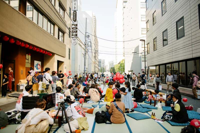 メイン会場となる神田ポートビル周辺の道路には、総計300畳の畳が並びます。靴を脱いで畳に足を踏み入れると、都会の真ん中に突然「内側の空間」が現れます。