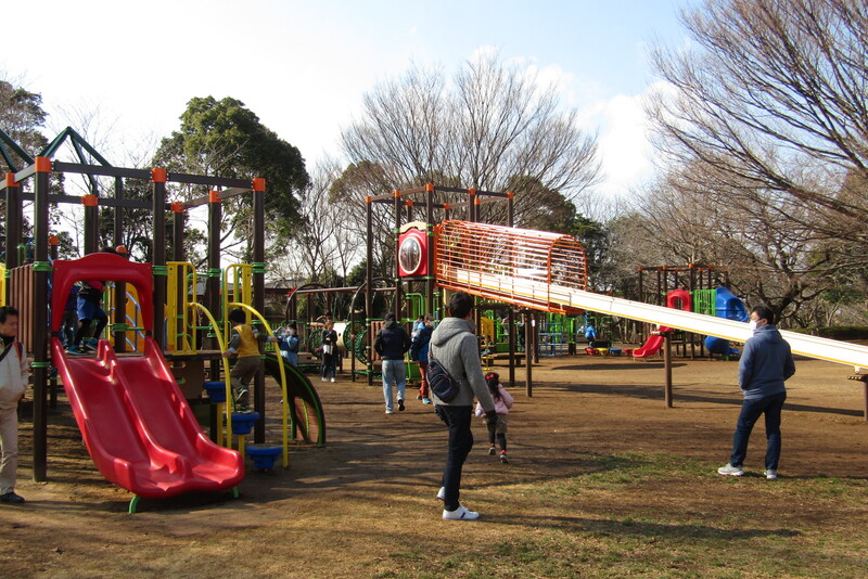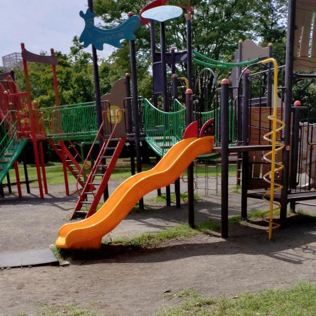 千葉市稲毛区の「穴川中央公園」は、すべり台やクライミングウォールなどの大型複合遊具や、幼児用遊具、広い原っぱがあり、さまざまな遊び方ができる公園です。