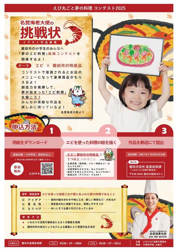 26日10:30〜12:00には、名誉海老大使を務める草地市長も登場し「えび丸ごと夢の料理コンテスト表彰式」が行われます。受賞作品は磐田市内のシェフによって実際にメニュー化され、お店で食べることができます。