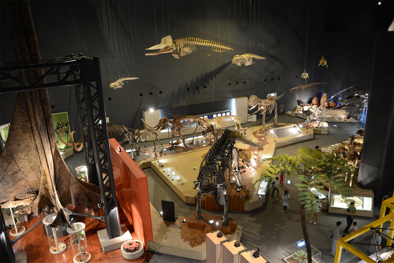 本物の隕石やアンモナイトの化石、恐竜の化石、マンモスの骨格標本など、見どころ満載! 青くキラキラ光る蝶や世界最大級のクマの剥製も必見です。恐竜を見下ろせるレストランやお弁当が食べられるラウンジもあり、家族みんなで一日中楽しめます。