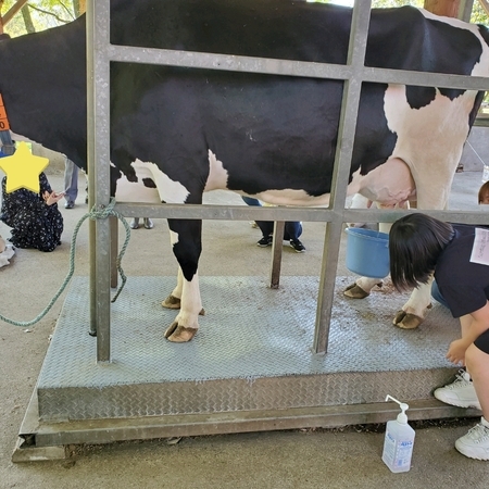 牛や馬、ヤギなどの動物とふれあえる「動物ふれあい広場」があり、牛の乳搾りやポニー乗馬などが楽しめます。