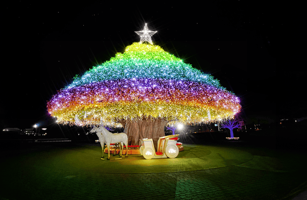 この巨大なツリーは、ダイナミックな光の演出が施されており、光と音楽が連動してさまざまな表情を見せてくれます。キラキラと光り輝くツリーは、記念撮影スポットとしても人気ですよ。