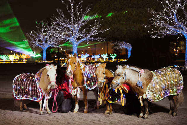 「東京メガイルミ」期間中に毎日開催されている「ふれあいイベント」では、たてがみや尻尾を結び、おめかししたお馬さんたちと一緒に記念撮影ができます。