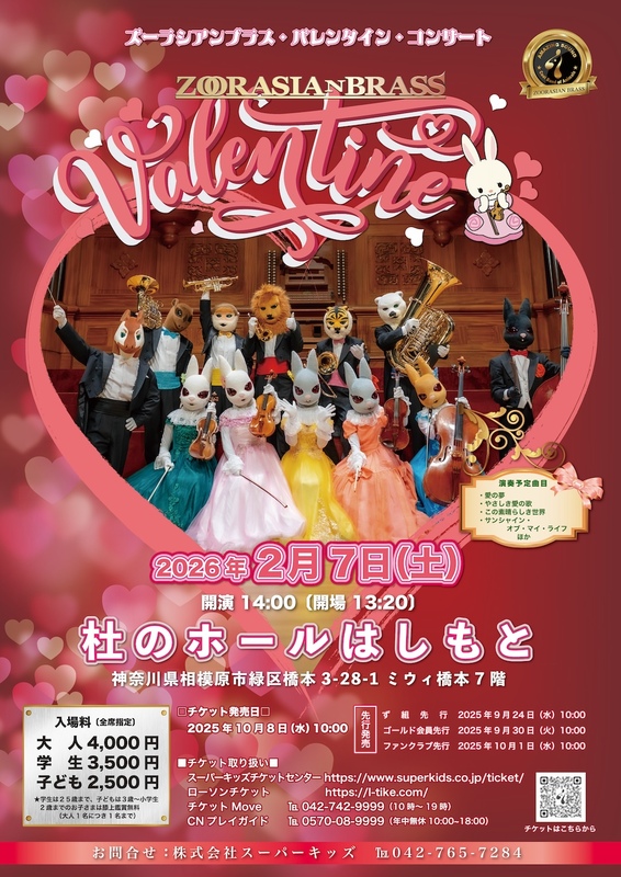 神奈川県相模原市緑区の杜のホールはしもとで、2026年2月7日(土)に「ズーラシアンブラス・バレンタイン・コンサート」が開催されます。