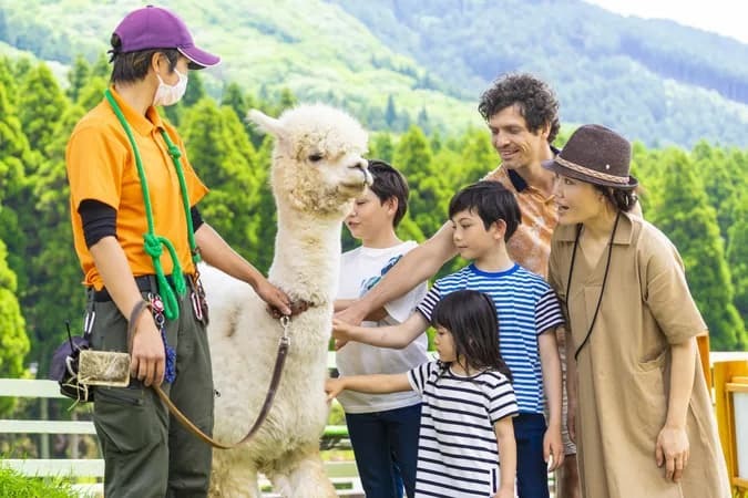 カピバラ・アルパカ・カンガルーなど珍しい動物との出会いに加え、アイスクリーム作りやレザークラフトなどの体験教室、アスレチック、芝すべりなど遊びがいっぱい!
