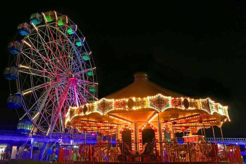 「わくわくランド」ではアトラクションも夜まで営業し、ライトアップによって幻想的な雰囲気を楽しめます。千葉県内で一番高い観覧車(最高到達点は330m)からは、イルミネーションや東京湾の夜景が一望できます。メリーゴーランドやサイクルモノレールなどもあり、親子で楽しめます。