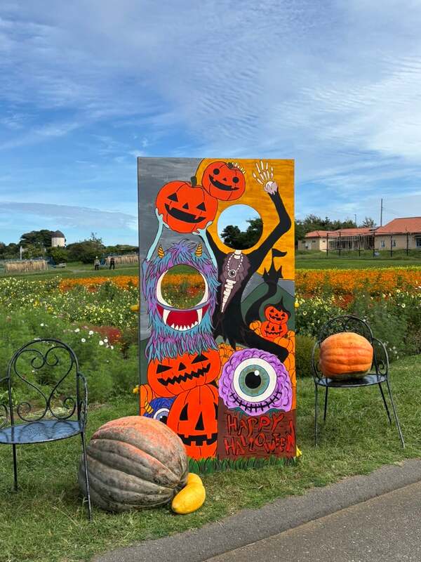 パンプキンやおばけたちが園内に現れ、ハロウィンの顔出しパネルやフォトスポットも設置されており、可憐なコスモスとハロウィンの共演が楽しめます。
