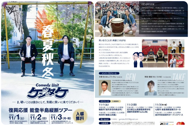 「ゲンタケ」は、能登の復興を願い、能登出身の俳優・本郷弦と勢登健雄で結成されたコメディーユニットです。震災後の能登を舞台に、笑いと希望に満ちた4つのお話が繰り広げます。