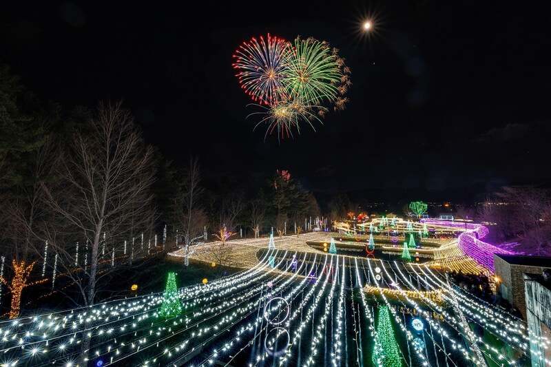 18時30分から約5分間、段々原っぱで観覧できます。夜空にきらめく花火とイルミネーションのコラボレーションは圧巻です。