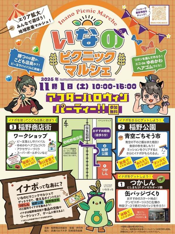 ハロウィン翌日の開催にちなみ、当日は「アフターハロウィンパーティー」として仮装での来場も大歓迎です。仮装して訪れた方には、稲野商店街のフォトスポットにて+1イナポがプレゼントされます。