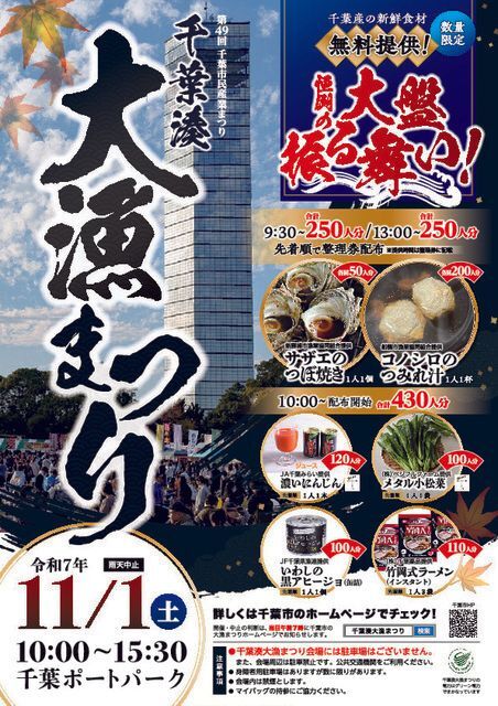 千葉県千葉市の「千葉ポートパーク」では、2025年11月1日(土)に、「千葉湊大漁まつり 第49回千葉市民産業まつり」が開催されます。