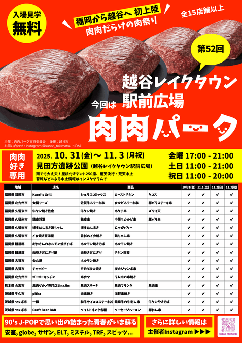 埼玉県越谷市の「見田方遺跡公園(越谷レイクタウン駅前広場)」では、2025年10月31日(金)・11月1日(土)・11月2日(日)・11月3日(月・祝)の4日間に、「第52回 肉肉パーク 越谷レイクタウン駅前」が開催されます。