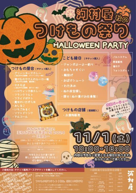 人気商品「玉ねぎのお漬物」の新味試食会もあり、お土産用の漬物購入もできる、食とハロウィンが融合した親子で楽しめるグルメイベントです。