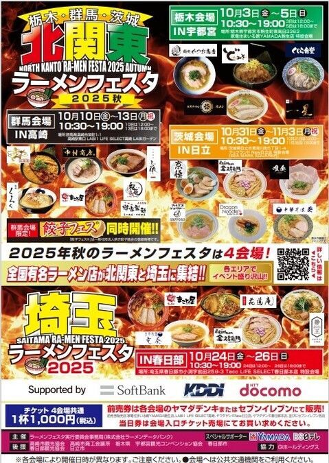 茨城県日立市のシーマークスクエア内のテックランドNew日立店特設会場では、2025年10月31日(金)・11月1日(土)・11月2日(日)・11月3日(月・祝)に、「北関東ラーメンフェスタ2025秋」が開催されます。