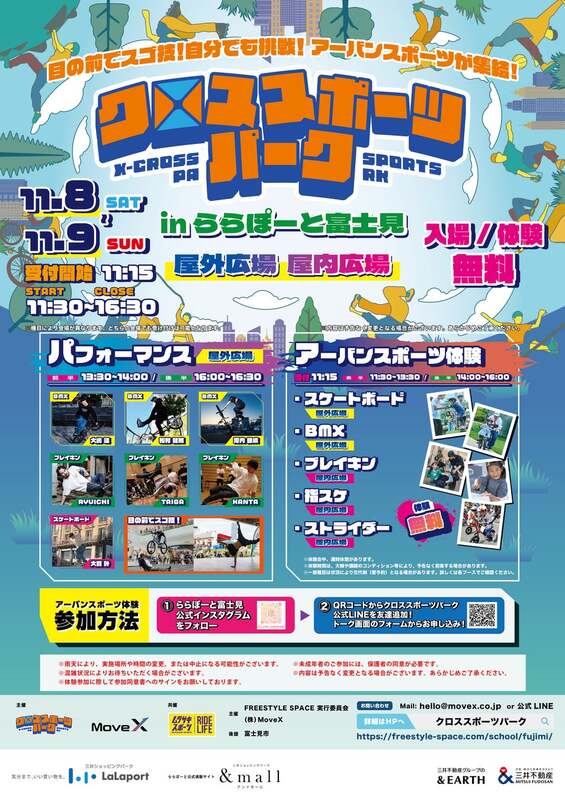 本イベントはムラサキスポーツとの共催で、ムラスポ公認キャラクター「パープルくん」やムラスポライダーの参加など、ららぽーと富士見でしか見られないコラボレーション企画を実施予定です。富士見市の後援も受けており、地域と連携したアーバンスポーツイベントとして注目されています。