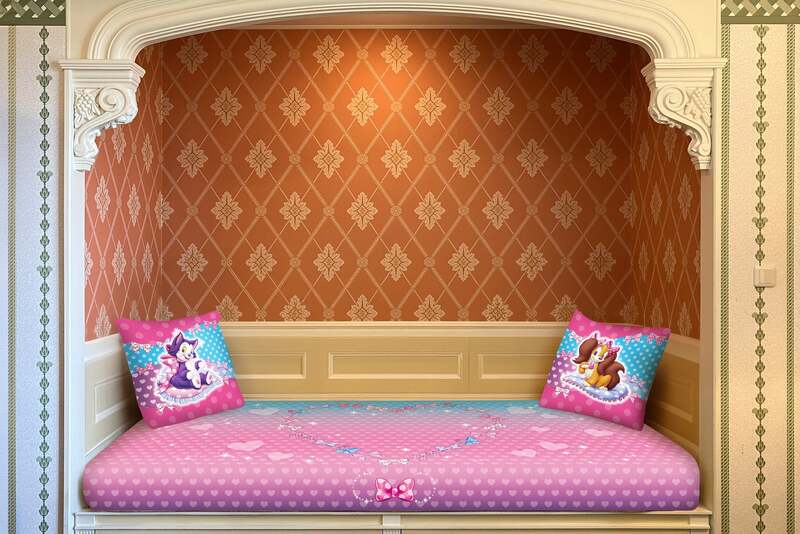 壁のくぼみを使用したアルコーヴベッドには、ミニーが大好きなドット柄のベッドカバーや、フィガロとフィフィが描かれたクッションがあしらわれています。