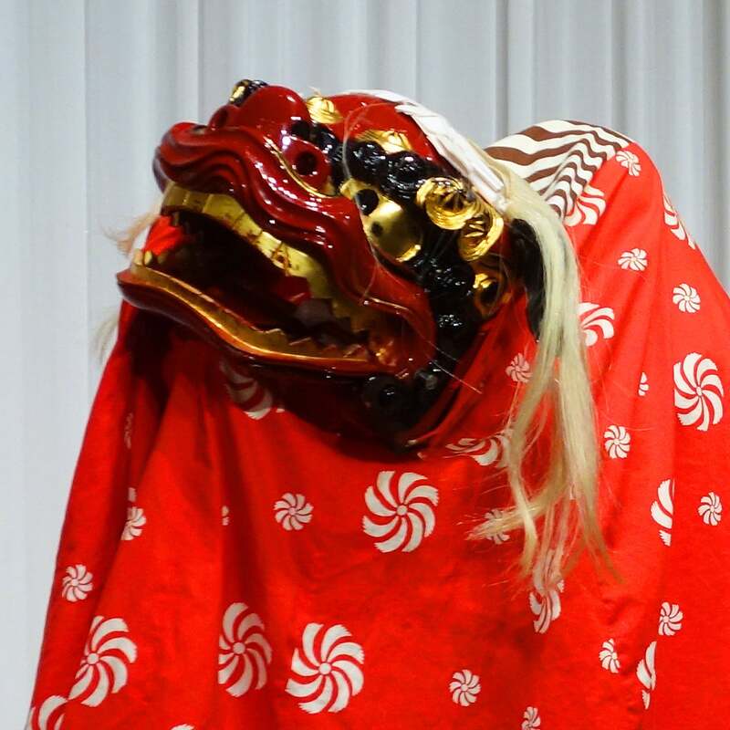 寿獅子舞は、東西屋社中による伝統の舞です。五穀豊穣、無病息災を祈念する神事として古くから親しまれてきました。獅子に頭を噛んでもらうと1年間病気にならずに済むという言い伝えもあり、会場内を廻ります。