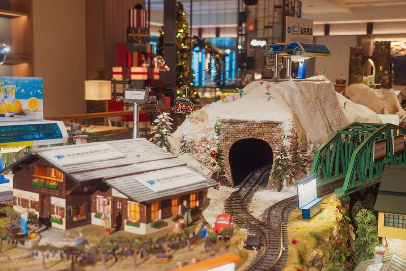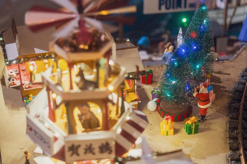 ジオラマの中にはサンタクロースの姿も隠れており、毎年、子供たちが目を輝かせながらサンタを探す微笑ましい光景が広がります。色とりどりの貨車を連ねた列車が、繊細なミニチュアの世界を駆け抜ける風景は、まるで夢の中にいるかのような美しさです。