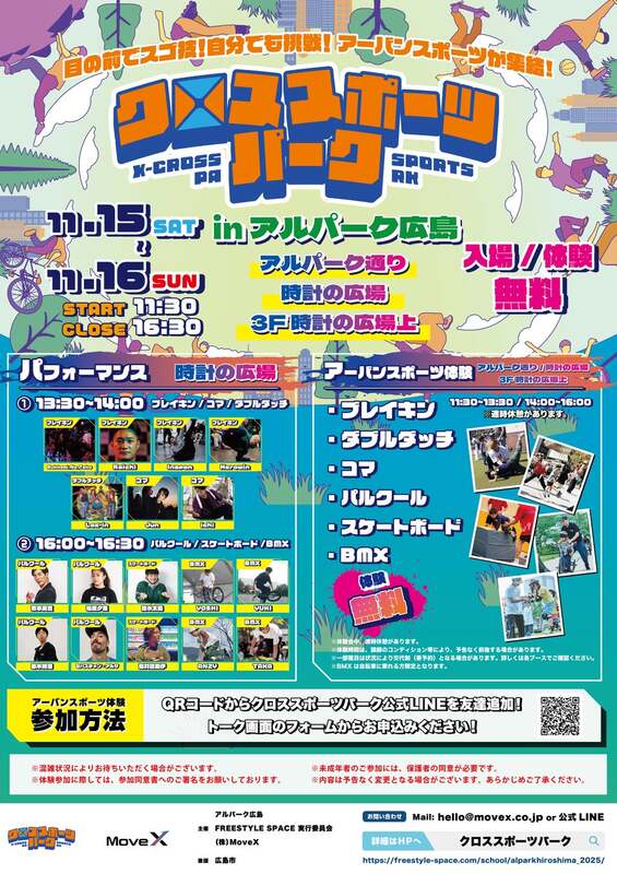 会場はアルパーク広島のアルパーク通り、時計の広場、3F時計の広場上の3つのエリアで展開されます。11時30分から16時30分までの開催時間中、さまざまなアーバンスポーツ体験やパフォーマンスを楽しむことができます。