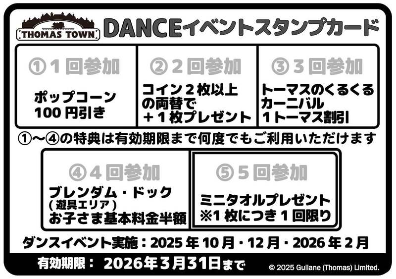 トーマスタウンでは、2025年12月1日(月)〜12月25日(木)の期間、クリスマスダンスイベントが実施されます。開催時間は平日14:00〜、土日15:00〜です。DANCEイベントスタンプカードで参加した回数に応じて、さまざまな特典がもらえます。
