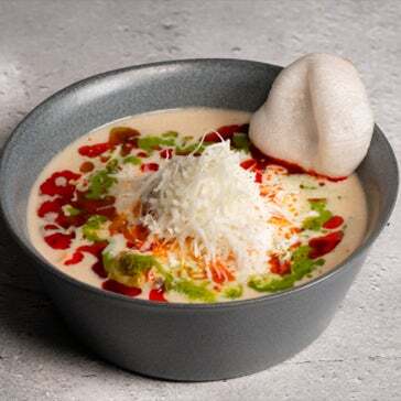 「豆乳とゴマの中華風クリスマスチャウダー」は、エビ・かき・サーモンをのせた野菜たっぷりのクラムチャウダー。赤と緑の辛さのソースでクリスマスリースを表現しています。