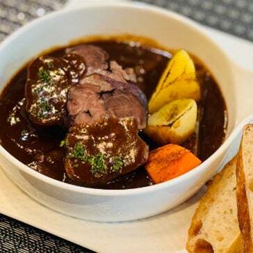 新潟の人気ブランド牛「あがの姫牛」を使ったビーフシチューは、塊肉を20時間かけて仕上げた牛骨スープとともに、赤ワインと香味野菜、デミグラスソースで8時間じっくり煮込んだ一品です。口に運ぶたび、ほろりとほどける柔らかさと豊かな味わいが広がります。